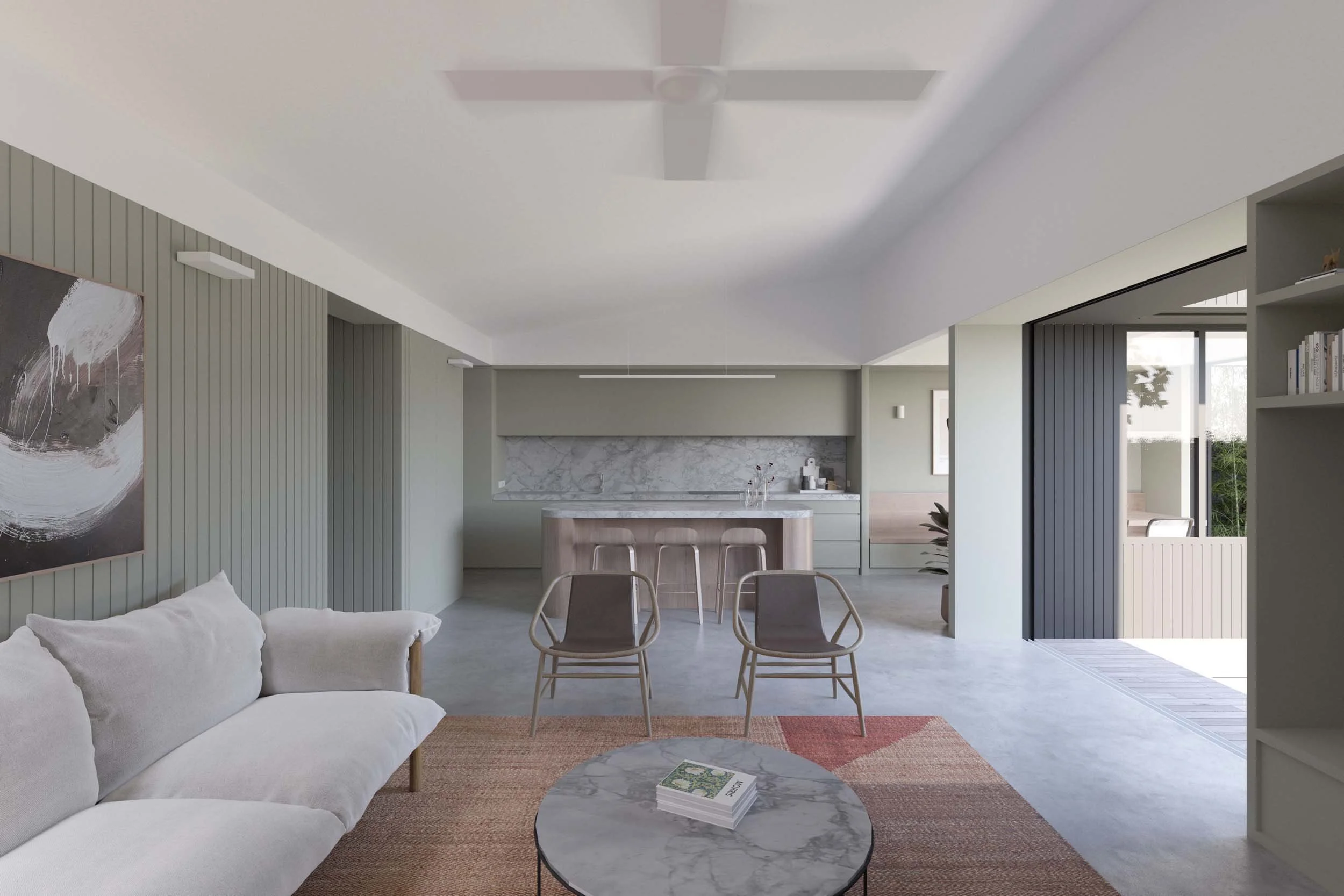 In response to this context, we developed a scheme that provided a link between the house and the garage along the southern boundary to screen the tall neighbours and form a private north-facing garden. The U-shaped plan also provided the opportunity to position the outdoor entertaining area to one side allowing the new living room to have immediate access to the garden.