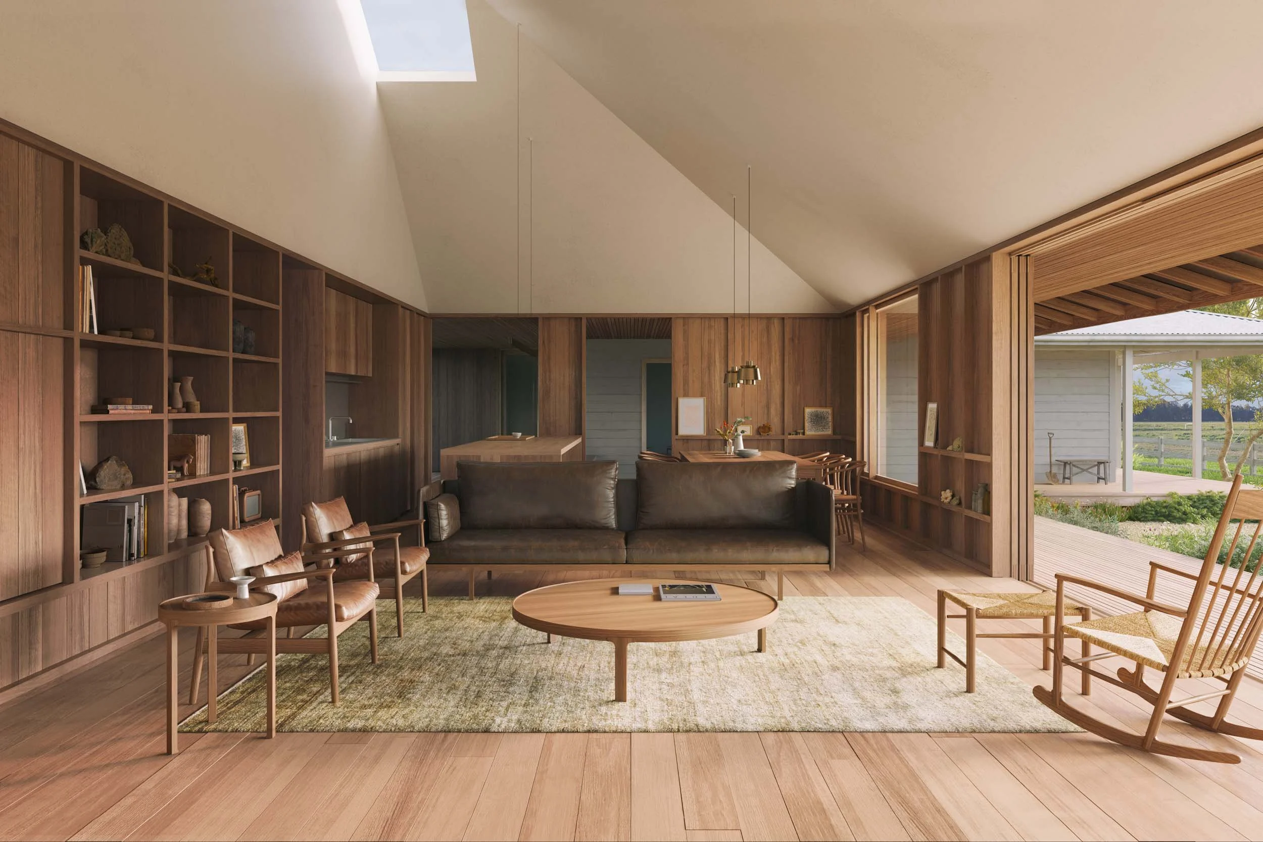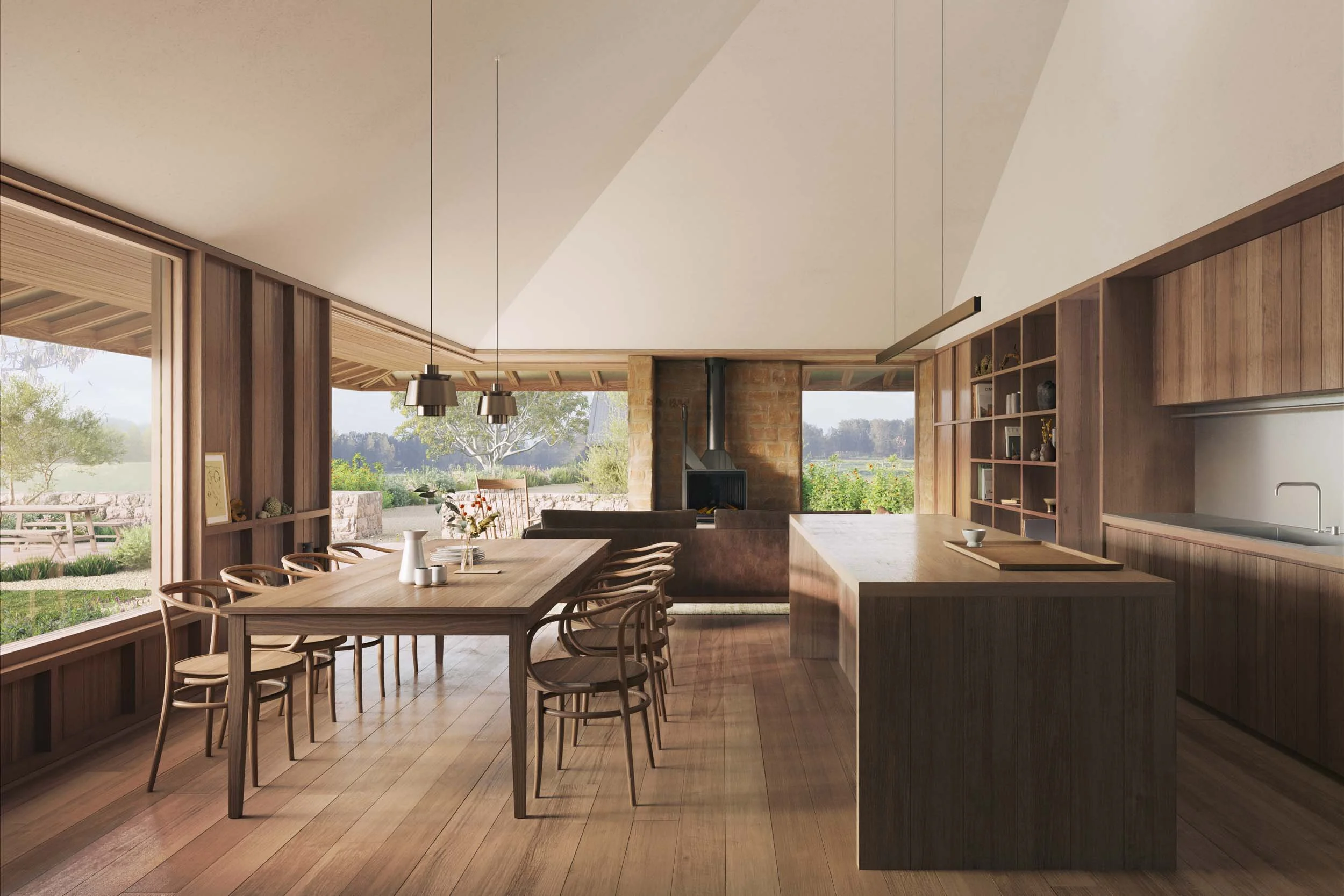 Our strategy was to develop a contemporary open plan pavilion that matched the footprint of the existing farmhouse to create an equally weighted dialogue between the old and the new. The new pavilion is located behind the existing cottage and rotated at 90 degrees to frame the garden. This siting also allows the original scale of the cottage to be understood from the entry before discovering the second pavilion on approach.